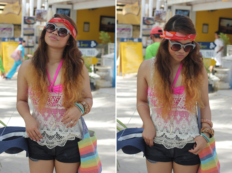 | pink monokini - props | crochet boho top - props | black denim cut-offs - onyx jeans | peacock sandals - people are people | orange scarf as turban - thrifted | multi-colored knit bag - gifted by sister | oversized sunnies - urban outfitters | bangles and bead bracelets - downtown and bangkok finds |