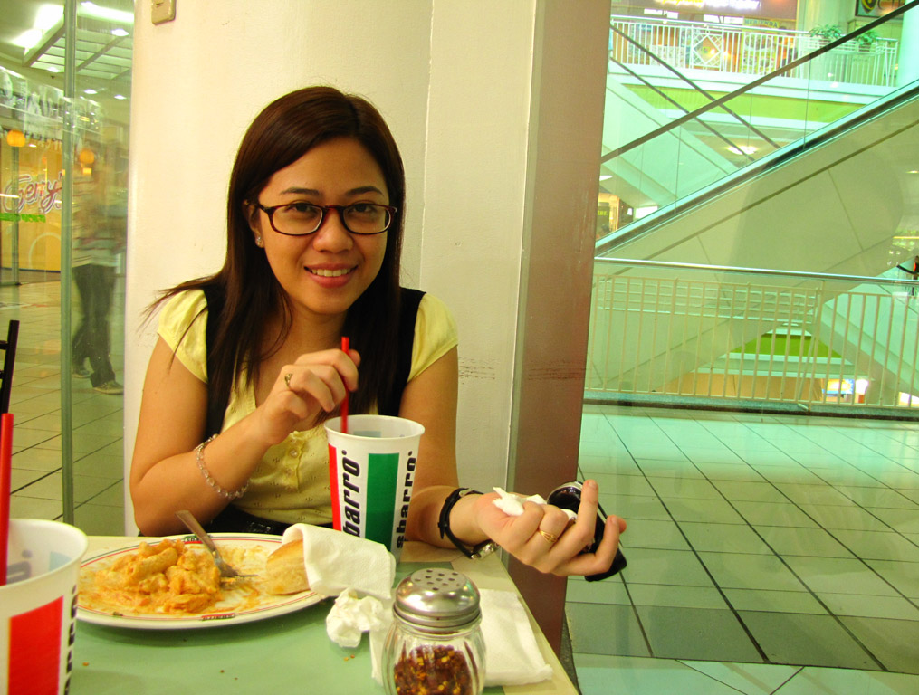 i immediately texted karen and invited her for lunch. we decided to eat at sbarro because we know they'd have good italian food and have big servings. boy, did i regret ordering my humongous sausage and pepperoni stuffed pizza! i mean, can somebody get dizzy after eating too much? apparently, i did! i wasn't able to take photos of the food before i started gulfing it down. i couldn't resist the dripping tomato sauce over the baked bread stuffed with cheesy goodness and perfectly salty sausage and pepperoni. here's how my plate looked like (and trust me, i am not doing this again!):